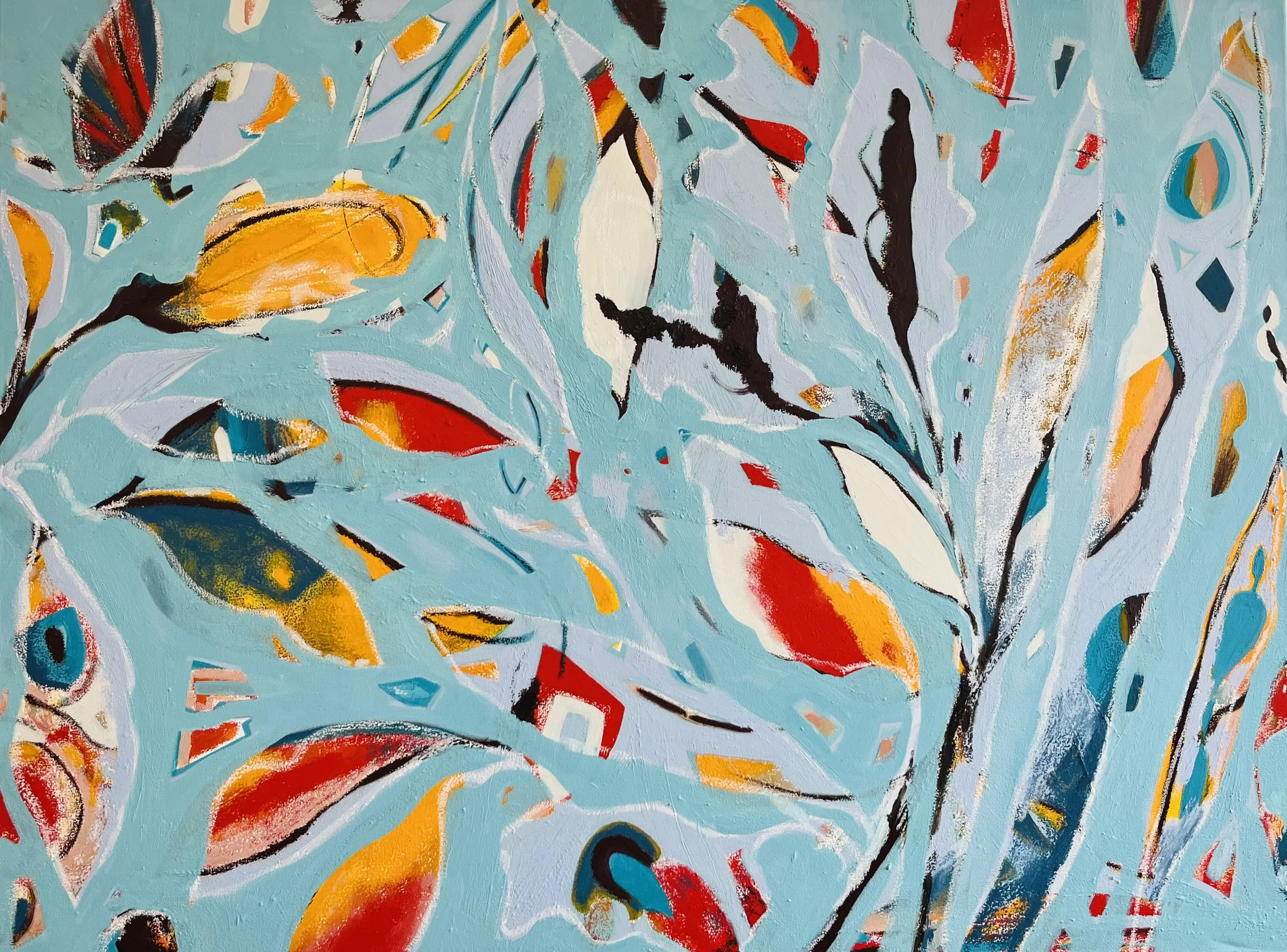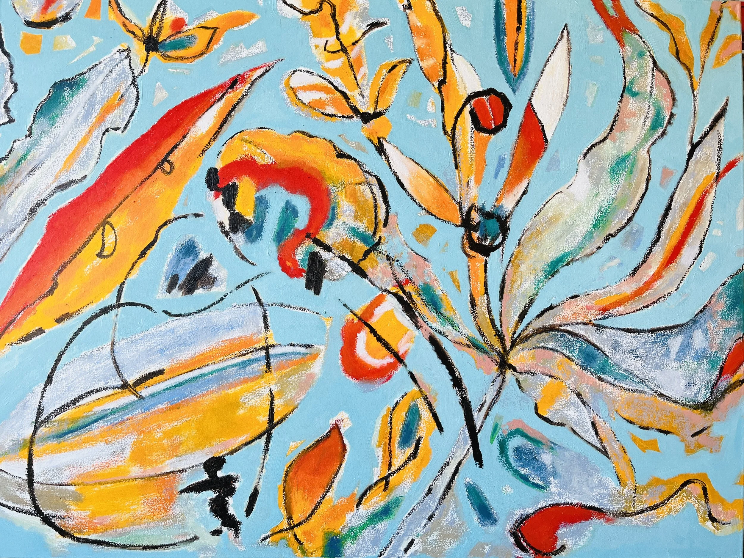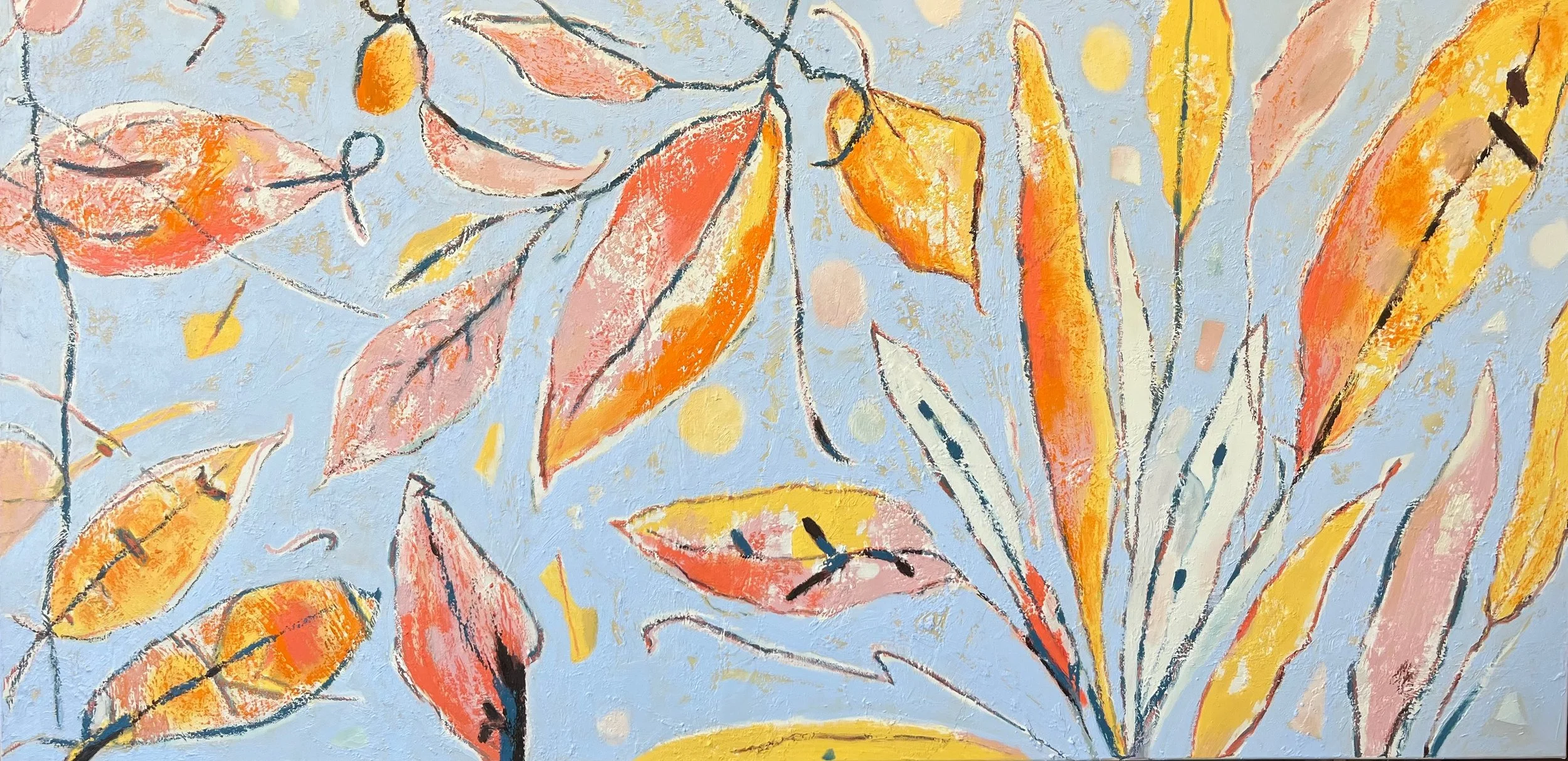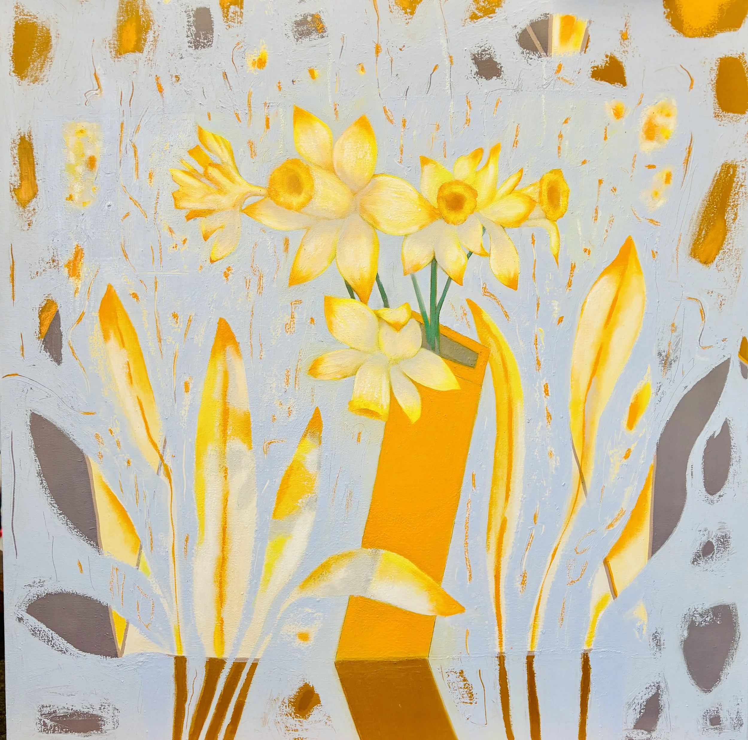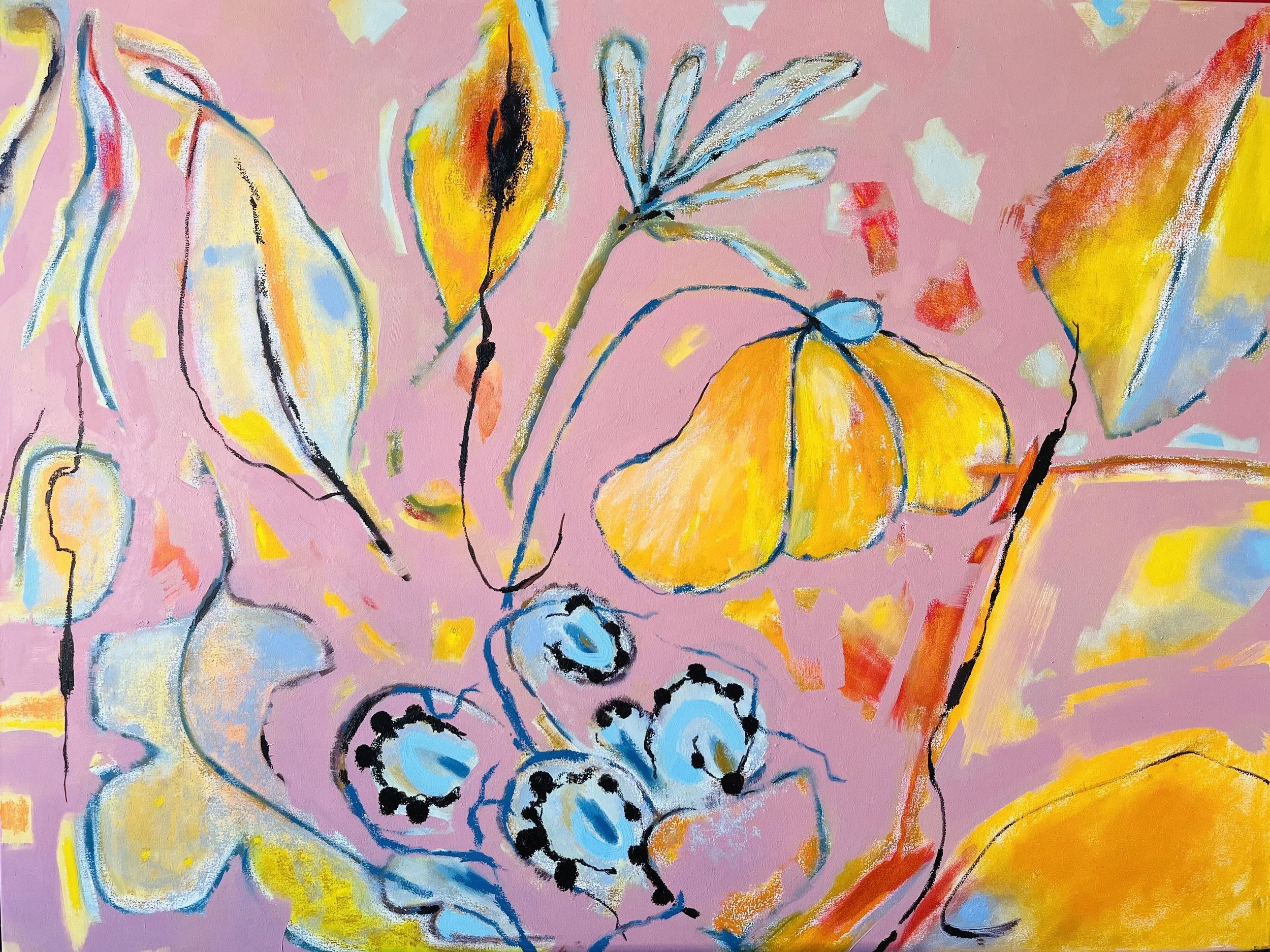 The painting was imagined in response to receiving a gift of flowers from a fellow artist as a ‘thank you’. This thoughtful gift prompted me to consider what a visual celebration of the notion of friendship might look and feel like.